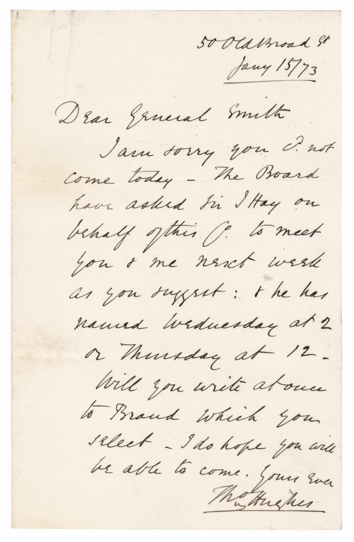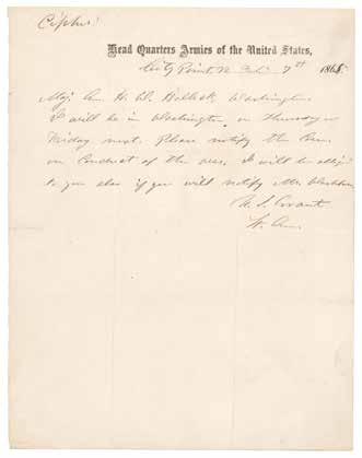 Signed to Gen. Halleck on the Committee on the Conduct of the War (1865). Civil War-dated ALS signed “U. S. Grant, Lt. Gen.,” one page, 7.75 x 9.75, Head Quarters Armies of the United States letterhead, February 7, 1865. Handwritten telegram to Major General Henry Halleck, sent from his headquarters at City Point, Virginia, marked “Cipher” in the upper left. In full: “I will be in Washington on Thursday or Friday next. Please notify the Com. on Conduct of the War. I will be obliged to you also if you will notify Mr. Washburne.” In fine condition.