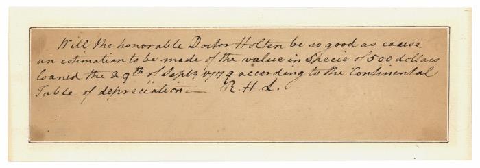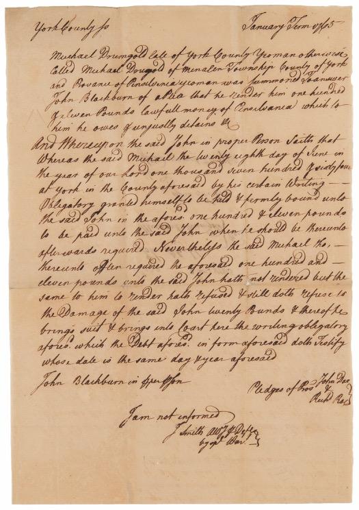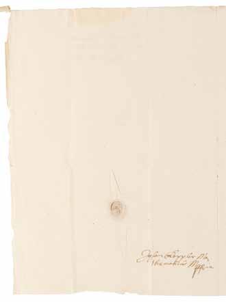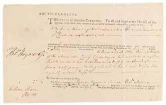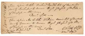 138. Thomas Heyward, Jr. Document Signed. Signer of the Declaration of Independence from South Carolina (1746-1809) who was taken prisoner by the British during the siege of Charleston and held for about a year. Partly-printed DS, signed “Tho’s Heyward Jun’r,” one page, 12.75 x 7.75, June 14, 1788. Order issued in South Carolina, ordering that Richard Wainwright be compelled to “be and appear before the Justices of the said State, at the Court of Common Pleas… to answer to William Hasell Gibbes…in a plea that he render to him Nine Hundred & fifty two Pounds & Eleven pence half penny Sterling which to him he owes.” Boldly signed in the upper left by Heyward. The white paper seal affixed to the upper left remains intact. In fine condition, with complete archival silking to both sides. Accompanied by the original receipt from Walter R. Benjamin Autographs. From the collection of Howard Reiche. Starting Bid $200