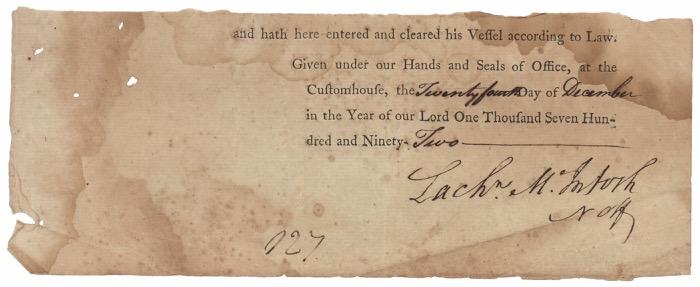 2. John Adams Document Signed as President - Four-Language Passport for the Ship Minerva. Partlyprinted DS as president, one page, 19.5 x 15.5, October 3, 1797. Four-language ship’s paper issued to “Thomas Cutss, Jun’r, master or commander of the Ship called Minerva…lying at present in the port of Ch’ston, bound for Amsterdam and laden with Rice, Sugar, Coffe, Cotton, Logwood& Rum.” Prominently signed at the center by President John Adams and countersigned by Secretary of State Timothy Pickering and by Collector James Simons. The original embossed white seal remains affixed to the left side. In fine condition, with some minor edge loss and fold splits. A scarce and sought-after oversized format, boasting a large signature of America’s second president. From the collection of Howard Reiche. Starting Bid $500