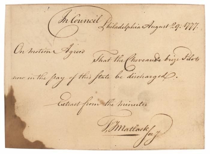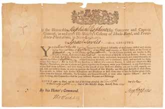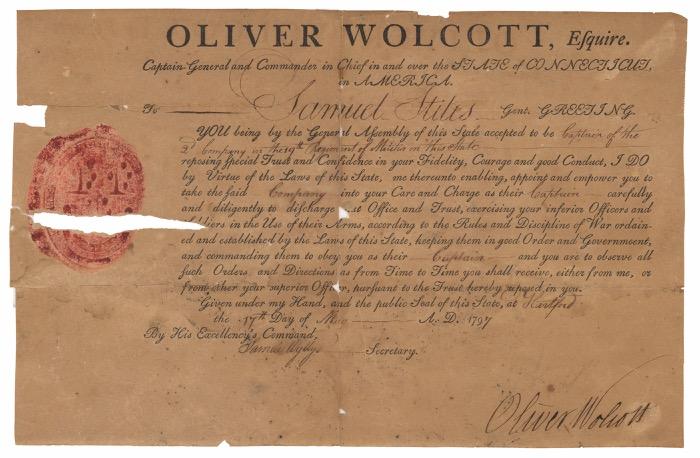 139. Stephen Hopkins Document Signed as the Colonial Governor of Rhode Island. Signer of the Declaration of Independence from Rhode Island (1707-1785) who served as the colony’s governor in the 1750s and 1760s. Partly-printed DS, signed “Step. Hopkins,” one page, 12.5 x 8, May 12, 1755. As governor of Rhode Island, Stephen Hopkins appoints Israel Sayles as “Captain of the first Company, or Train’d Band, of the Town of Glocester in the County of Providence in the Colony aforesaid…in His Majesty’s Name, George the Second.” Signed at the conclusion by Hopkins, and countersigned by Thomas Ward as secretary. The original paper seal remains affixed to the upper left corner. In very good to fine condition, with some fold splits and edge loss, none of which affects the signature. From the collection of Howard Reiche. Starting Bid $200