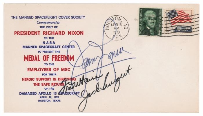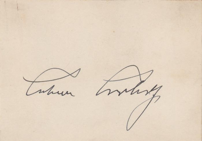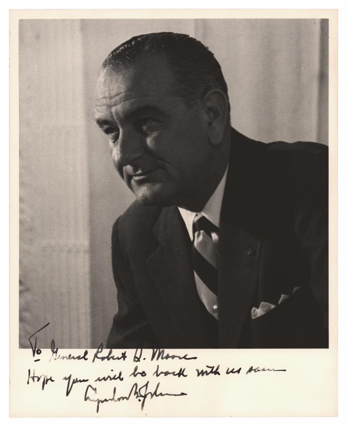 Signed as President. Rare ANS as president on an official 4 x 2.25 card embossed with the presidential seal, no date. Handwritten note to Robert Perry in Bethesda Naval Hospital. In full: “To Bob—Sorry to hear of your being in the hospital! Take care—get well—Hurry back—Our best always, Lyndon B. Johnson.” In fine condition. Accompanied by the official White House transmittal slip addressed in type to Perry at the hospital as well as the original envelope for the card bearing the same embossed presidential seal on the flap. Provenance: The Everett Fisher Collection. Starting Bid $200