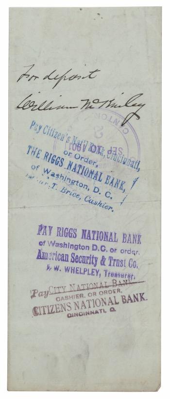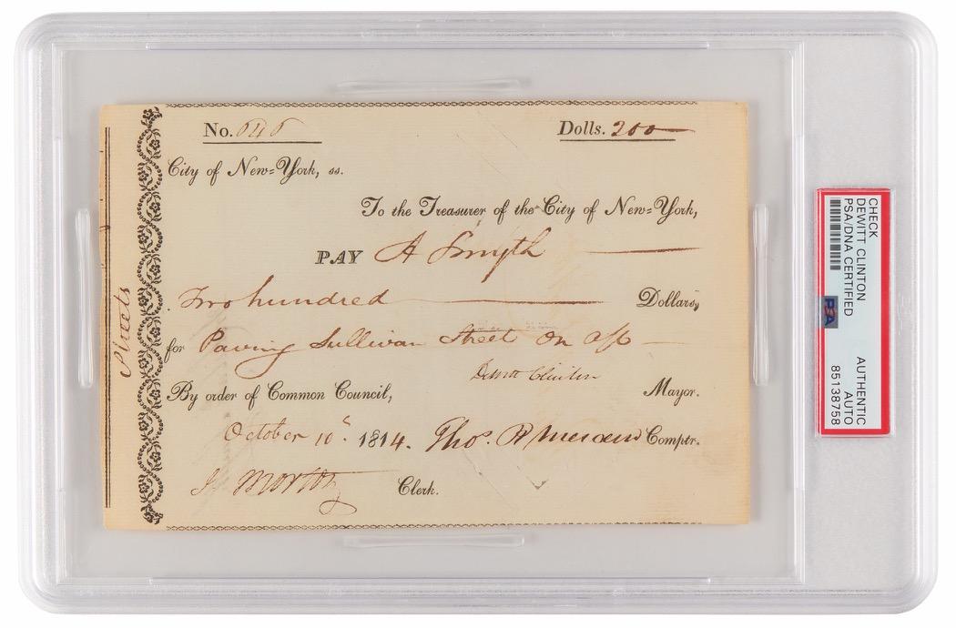 4. James Madison Signed Check as President. Office of Pay and Deposit of the Bank of Columbia ‘private account’ check, 7 x 2.5, filled out and signed by Madison as president, “James Madison,” payable to Butler & Co. for $353.59, August 9, 1813. In very good to fine condition, with light overall creasing. Encapsulated in a PSA/DNA authentication holder. Starting Bid $300