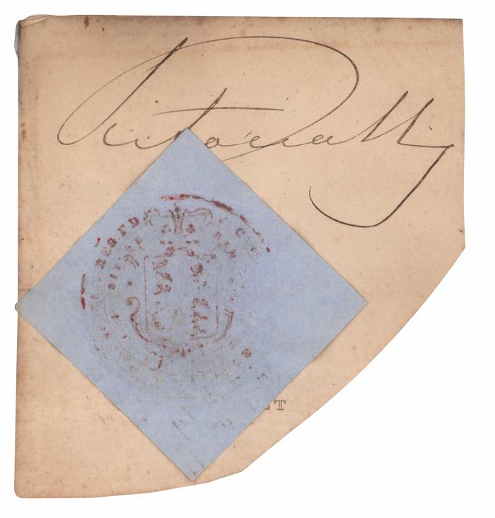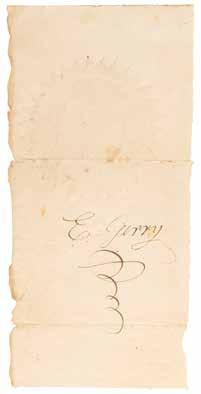 136. Elbridge Gerry Signature. Signer of the Declaration of Independence from Massachusetts (1744–1814) who later served as vice president under James Madison. His name entered the language as a result of his support of politically advantageous redistricting, which became known as ‘gerrymandering.’ Ink signature, “E. Gerry,” on an off-white 3.5 x 7.5 sheet clipped from a document, which retains its original off-white seal. In fine condition. From the collection of Howard Reiche. Starting Bid $200