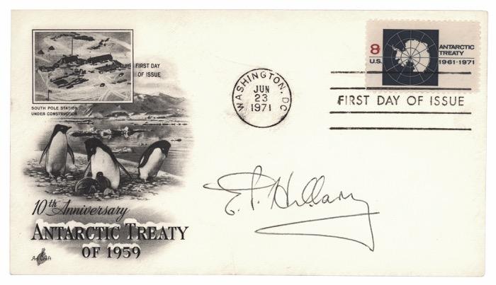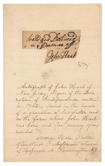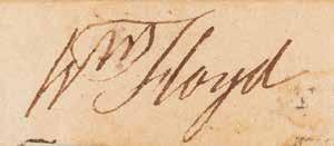 133. William Floyd Signature. Signer of the Declaration of Independence and a U.S. representative from New York (1734–1821). Scarce ink signature, “Wm. Floyd,” on an off-white 4 x .75 slip, which is affixed to a manuscript letter from his grandson by his first marriage, William Floyd, one page, 7.25 x 5 sheet, March 11, 1876, addressed to Dr. G. W. Vamin, who had requested a letter or document bearing his grandfather’s signature. The grandson tells the doctor that the past 50 years have exhausted his supply and that this is all he has left, noting that the doctor’s request is the third he has received today. This was the Centennial Year and the Revolution and the Declaration of Independence were receiving a lot of attention. In very good to fine condition. From the collection of Howard Reiche. Starting Bid $200