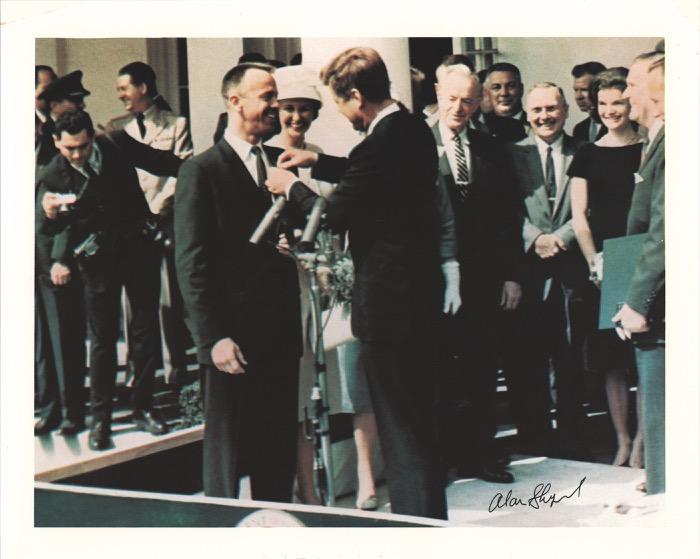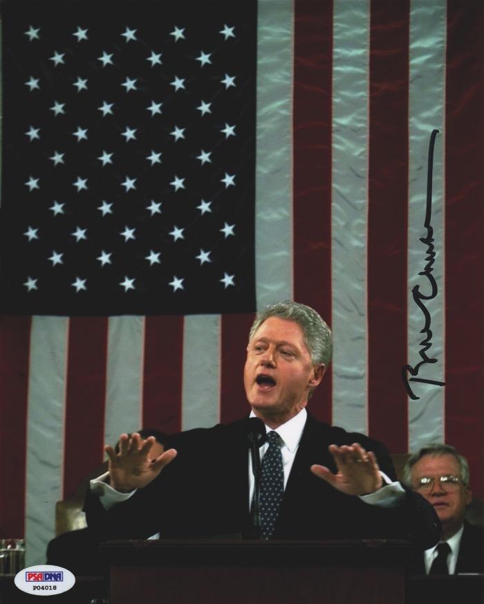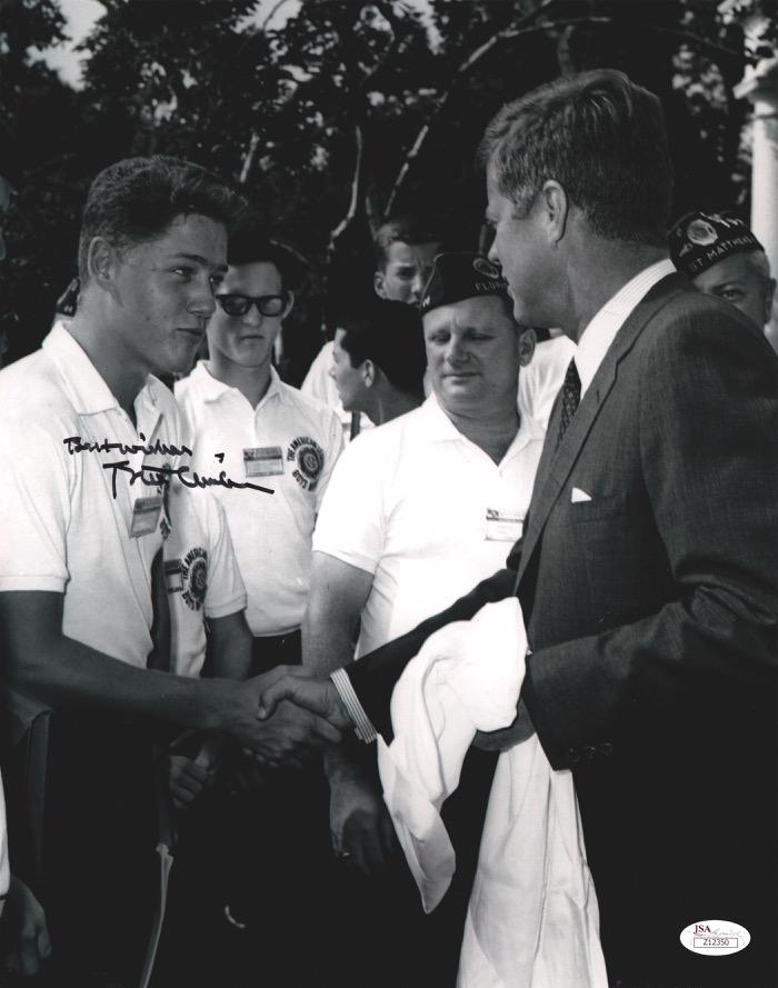 32. John F. Kennedy Signed Photograph. Vintage semi-glossy 10 x 8 LOOK Magazine photo of John F. Kennedy in conversation with Sue Seay from LOOK Magazine, signed and inscribed in fountain pen, “For Sue Seay – with warmest personal regards, John F. Kennedy.” In very good to fine condition, with scattered creasing, and some emulsion irregularity to the woman’s face, visible at an angle. Accompanied by a full letter of authenticity from PSA/DNA. The April 26, 1960 issue of LOOK Magazine featured a copiously illustrated seven-page spread titled ‘To meet the elite… all you need is gall” written by Sue Seay (pages 42-48). The offered photograph was reproduced for the issue and was captioned, “JOHN F. KENNEDY. When I introduced myself to the Senator, he said, ‘Sue, why yes, of course.’ He acted as though we’d met before, but we hadn’t. I think he still looks like a Harvard undergraduate, although he has done something different with his hair. It doesn’t fall down on his forehead any longer. His life looked divine. I wish I could wear shocking pink as well as she does. I stayed around Mrs. Kennedy only a short time, because she is too much competition.” Starting Bid $300
