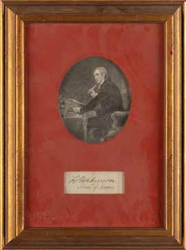 140. Francis Hopkinson Signature. Signer of the Declaration of Independence from New Jersey (1737–1791) who is also known as the designer of the first official American flag. Revolutionary War–era ink signature as Treasurer of Loans, “F. Hopkinson,” on an off-white 3.25 x 1.25 slip clipped from a document. Nicely matted and framed with an engraved portrait to an overall size of 10 x 13.5. In fine condition. Hopkinson served as treasurer for the Continental Loan Office in Philadelphia from 1778 to 1781. From the collection of Howard Reiche. Starting Bid $200