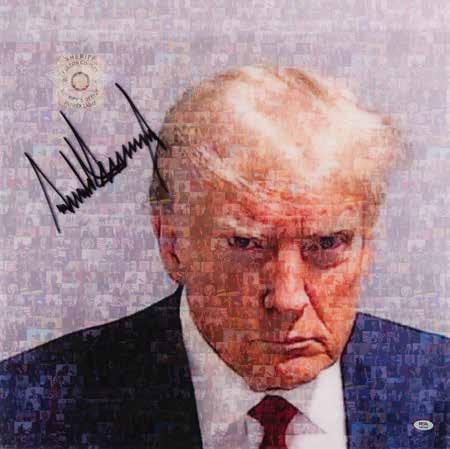 40. Donald Trump Signed ‘Mug Shot’ Plexiglas Print. Color 23 x 23 Plexiglas print of Donald Trump’s mug shot, which was taken at the Fulton County Jail in Atlanta, Georgia, on August 24, 2023, after Trump voluntarily surrendered himself to authorities following his indictment on charges of election racketeering and related offenses, signed prominently in black felt tip by Trump. The background of the print features an elaborate mosaic of hundreds of small images of Trump from his presidential administration. In very fine condition, with the lower right bearing an affixed PSA authenticity label. Accompanied by a full letter of authenticity from PSA/DNA.Starting Bid $200