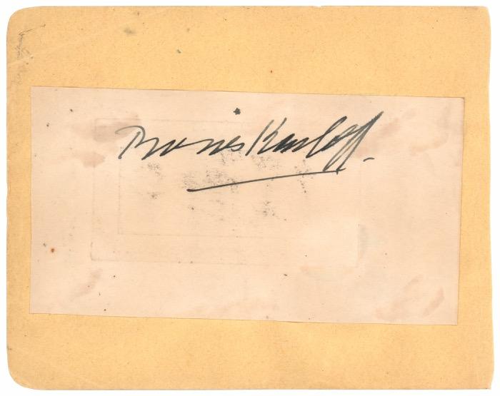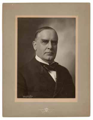 23. William McKinley Signed Photograph. Matte-finish 5.5 x 7.5 bust-length photo of William McKinley by Courtney of Canton, Ohio, signed in fountain pen. Mounted to an overall size of 8.5 x 11. In fine condition, with moderate signature contrast against his dark suit. Accompanied by a full letter of authenticity from PSA/DNA. Starting Bid $200