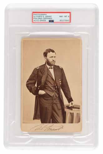 15. U. S. Grant Signed Cabinet Photograph, Pictured in His Four-Star Military Uniform by Mathew BradyPSA NM-MT 8. Exceptionally rare cabinet photo of General U. S. Grant by Mathew Brady, 4.25 x 6.5, depicting the Commanding General of the American Army wearing his four-star military uniform in a handsome three-quarter-length pose, signed neatly in the lower border in fountain pen. The reverse bears a “Brady, Photo. Wash, D.C.” stamp. In fine condition. Encapsulated and graded by PSA/DNA as “NM-MT 8.” Signed Brady portraits of Grant in his military uniform are tremendously rare, and its crisp signature and clear and stately image further accentuate its unique desirability. Starting Bid $300