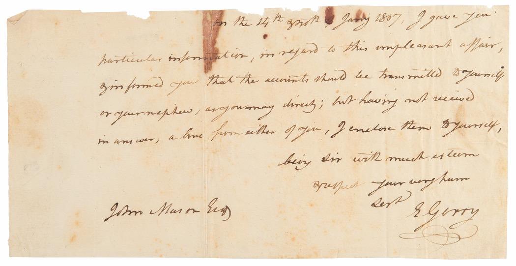 132. William Ellery Autograph Letter Signed. Signer of the Declaration of Independence from Rhode Island (1727–1820). ALS signed “Wm. Ellery Coll.,” one page, 7 x 8.75, December 7, 1796. Handwritten letter to Ray Greene, district attorney for Warwick, Rhode Island, questioning the status of foreign vessels being repaired in Rhode Island. In part: “I have this day transmitted to the Governor two letters from the British Vice Consul to me respecting certain repairs & alterations made in the French National Brig now in this Port, which he seems to think are not justified by the acknowledged Laws of Nations concerning Neutrality confirmed by the Act of the United States...Permit me from a want of time to refer you to the Governor...You will recollect the case of the Brig Brutus which was repaired & converted into a Ship at Philadelphia, and that of a Schooner Privateer which was repaired at Charleston, both which cases were before the last Circuit Court held here.” Housed in a handsome custom-made full red leather triptych folder. In fine condition, with a seal-related stain to the left edge. From the collection of Howard Reiche. Starting Bid $200