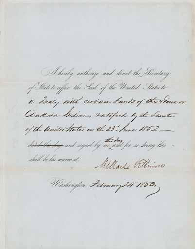 11. Millard Fillmore Document Signed as President, Ratifying a Treaty with the Upper Dakota Sioux. Partly-printed DS as president, one page, 8 x 10.5, February 24, 1853. President Fillmore directs the Secretary of State to affix the Seal of the United States to “a Treaty with certain bands of the Sioux or Dakota Indians, ratified by the Senate of the United States on the 23’d June 1852.” Signed at the conclusion by Millard Fillmore. In fine condition, with faint toning to the folds and edges.