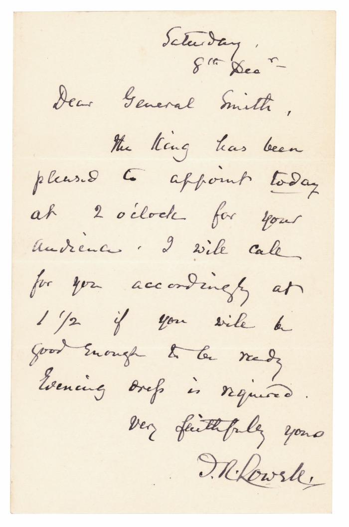 22. Benjamin Harrison Document Signed as President, Replying to a Letter of Condolence from King Kalakaua. Partly-printed DS as president, signed “Benj. Harrison,” one page, 8 x 10, May 17, 1889. President Harrison directs the Secretary of State to cause the Seal of the United States to be affixed to “an envelope containing my letter addressed to His Majesty, Kalakaua, King of the Sandwich Islands, acknowledging letter of condolence on the Samoan disaster.” Signed boldly at the conclusion by Benjamin Harrison. In fine condition.