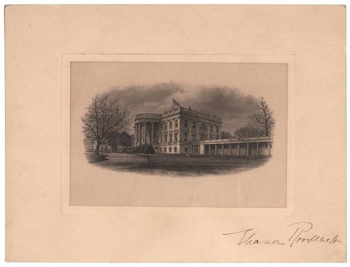 24. Theodore Roosevelt Signed White House Engraving. Vintage engraving of the North Portico of the White House, 5.25 x 3.75, signed in bold fountain pen by Theodore Roosevelt. Archivally matted and framed with a portrait of Roosevelt to an overall size of 15 x 9.75. In fine condition. Starting Bid $200