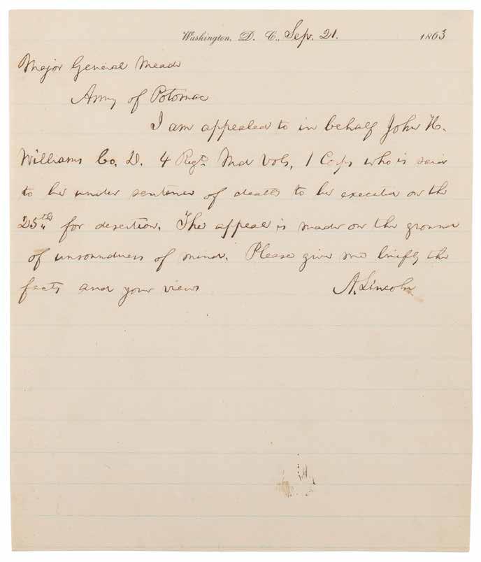 13. Abraham Lincoln Civil War-Dated Autograph Letter Signed as President to Maj. Gen. Meade on Capital Punishment for an Army Deserter. ALS as president, signed “A. Lincoln,” one page, 7.25 x 8.75, September 21, 1863. Handwritten letter to Major General George Meade, commander of the “Army of the Potomac,” in full: “I am appealed to in behalf John H. Williams, Co. D. 4 Regt. Md. Vols., I Corps who is said to be under sentence of death to be executed on the 25th for desertion. The appeal is made on the ground of unsoundness of mind. Please give me briefly the facts and your views.” In fine condition, with trimmed edges, and overall archival silking to both sides.