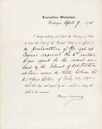 21. Grover Cleveland Document Signed as President, Prohibiting the Hunting of Fur Seals. Partly-printed DS as president, one page, 8 x 10, Executive Mansion letterhead, April 9, 1894. President Cleveland directs the Secretary of State to cause the Seal of the United States to be affixed to “my proclamation of the Act of Congress approved the 6th instant, to give effect to the award rendered by the Tribunal of Arbitration at Paris under the treaty between the U. S. & Great Britain of Feby 29, 1892.” Signed neatly at the conclusion by Grover Cleveland. In fine condition. This document relates to Cleveland’s signing of Proclamation 364: Prohibiting the Hunting of Fur Seals on April 6, 1894, an act designed to drastically limit the hunting of fur seals by both the United States and Great Britain in and around the Bering Sea. Starting Bid $200