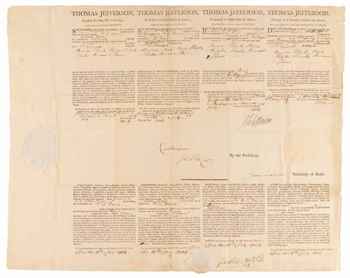 3. Thomas Jefferson and James Madison Signed Four-Language Ship’s Passport. Partly-printed DS as president, signed “Th: Jefferson” as president and “James Madison” as secretary of state, one page, 20.5 x 16.5, July 11, 1804. Four-language ship’s pass issued to “Lewis McMillan, master or commander of the Brig called Fame…lying at present in the port of Biddeford, bound for St. Vincent and laden with Boards, Plank, Staves, Shingles, Shooks, Bread & flour.” Neatly signed at center in ink by President Thomas Jefferson, and countersigned below by Secretary of State James Madison. The original white paper seal affixed to the left side remains fully intact. In very good to fine condition, with light edge wear, and splitting to the multiple intersecting folds (some reinforced with archival tape on the reverse); both signatures are clean and unaffected. United States ships carried four-language sea letters in the 18th and 19th centuries to show ownership, nationality, cargo, and destination. This example features a most desirable combination of presidents, boasting particularly bold, crisp autographs of Jefferson and Madison From the collection of Howard Reiche. Starting Bid $500