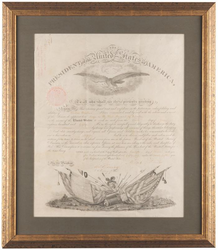 4. Abraham Lincoln Document Signed as President (March 11, 1862). Civil War-dated partly-printed vellum DS as president, one page, 13.75 x 17.75, March 11, 1862. President Lincoln appoints John Pilsen as “Assistant Adjutant General of Volunteers with the rank of Captain in the service of the United States.” Signed at the conclusion in ink by Abraham Lincoln and countersigned by Secretary of War Edwin M. Stanton. The upper left corner retains the original blue seal. In fine condition, with intersecting folds and scattered faint stains. Accompanied by an original 2.5 x 4 carte-devisite portrait photograph of Pilsen wearing his military uniform in a full-length pose.