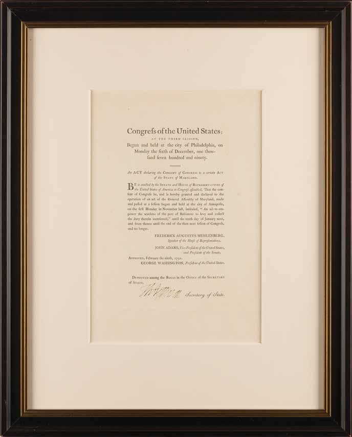 1. Thomas Jefferson Document Signed as Secretary of State - Act of Congress Permitting Maryland to Collect Baltimore Port Fees. DS as secretary of state, signed “Th: Jefferson,” one page, 7.75 x 11.75, February 9, 1791. Official printing of a resolution passed by the First Congress of the United States during its Third Session, headed “An Act declaring the Consent of Congress to a certain Act of the State of Maryland.” The act reads, in full: “Be it enacted by the Senate and House of Representatives of the United States of America in Congress assembled, That the consent of Congress be, and is hereby granted and declared to the operation of an act of the General Assembly of Maryland, made and passed at a session begun and held at the city of Annapolis, on the first Monday in November last, intituled, ‘An act to empower the wardens of the port of Baltimore to levy and collect the duty therein mentioned,’ until the tenth day of January next, and from thence until the end of the then next session of Congress, and no longer.” Imprinted at the conclusion with the names of Speaker Frederick Muhlenberg, Vice President John Adams, and President George Washington, and prominently signed below in ink by Secretary of State