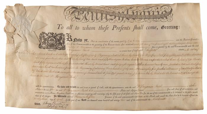 78. John Hancock Revolutionary War-Dated Document Signed, Appointing a Second Lieutenant in the Continental Army. Revolutionary War–dated partly-printed DS, one page, 13 x 8.75, April 16, 1777. As president of the Continental Congress, John Hancock appoints Percival Butler “to be second lieutenant of a Company of foot in the third Pennsylvania Regiment.” Prominently signed at the conclusion in ink by John Hancock as president, and countersigned by Charles Thomson as secretary. Affixed to an old piece of cardboard and in very good condition, with staining, toning, and small areas of paper loss, none of which adversely affect the bold signature.