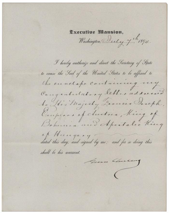 9. President U. S. Grant Seeks a Canal Agreement with ColombiaEarly 1871 Document Related to the Construction of the Panama Canal. Partly-printed DS as president, one page, 8.5 x 11, April 3, 1871. President Grant authorizes and directs the Secretary of State to affix the Seal of the United States to “my full power to Stephen A. Hurlbut, Minister Resident to Colombia, to conclude and sign a Convention for extending the time fixed for the exchange of the ratifications of the Treaty, between the two countries, signed on the 26th of January 1870.” Signed neatly at the conclusion by U. S. Grant. In fine condition.
