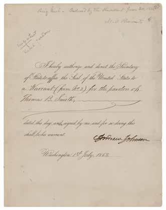 8. President Andrew Johnson Pardons a Confederate Brigadier General. Partly-printed DS as president, one page, 8.5 x 11, July 1, 1868. President Johnson authorizes and directs the Secretary of State to affix the Seal of the United States to “a Warrant (form No. 3) for the pardon of Thomas B. Smith.” Signed neatly at the conclusion by Andrew Johnson. In fine condition. In very good to fine condition, with old repairs to short tears along the right edge, and a small smudge to the first letter of the signature. Read more about Thomas Benton Smith online at www.RRAuction.com. Starting Bid $200
