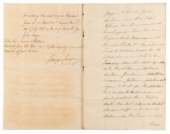 2. Thomas Jefferson and Levi Lincoln Document Signed as President and Acting Secretary of State (May 2, 1801). Rare partly-printed DS, signed “Th: Jefferson” as president and “Levi Lincoln” as acting secretary of state, one page, 22.25 x 17.5, May 2, 1801. Four-language ship’s paper issued to “Edward White of Newbern, master or commander of the Sch’r called the Romp…lying at present in the port of N. York bound for Tortola and laden with Flour, Corn, Beef & Shingles.” Signed in the center in crisp black ink by President Thomas Jefferson and countersigned by Acting Secretary of State Levi Lincoln. Also countersigned below by Joshua Sands as Collector of the Port of New York; Sands had served in the Revolution and would later represent New York in Congress. The left side retains its original two embossed seals. Impressively doublematted and framed with a portrait of Jefferson to an overall size of 34 x 38. In good to very good condition, with irregular light toning, tears, creases, and edge chipping, none of which adversely affect Jefferson’s signature.