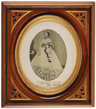6. Mary Todd Lincoln Signature. Ink signature, “Very truly, Mary Todd Lincoln,” on an off-white 4 x 1 slip, matted and framed with a portrait to an overall size of 15.5 x 17.5. In fine condition. Starting Bid $200