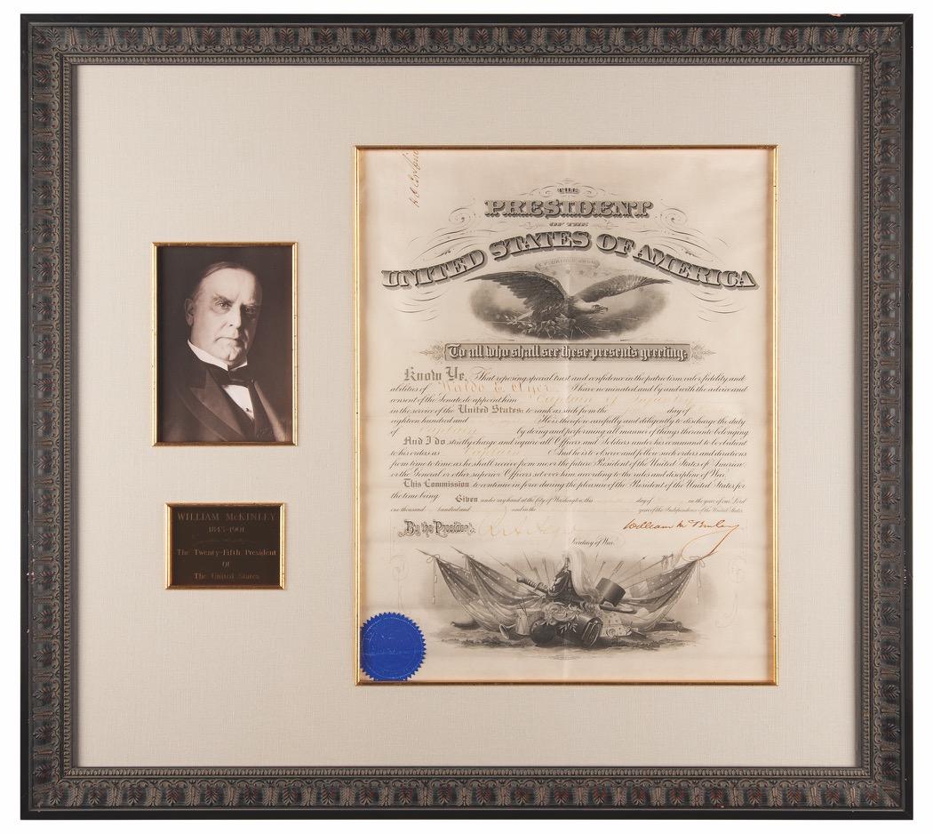 10. Abraham Lincoln Document Signed as President (August 1861) - Early Military Appointment for Orville E. Babcock, the Future Aide-de-Camp for General U. S. Grant. Civil War-dated partly-printed vellum DS as president, one page, 14.25 x 17.25, August 10, 1861. President Lincoln appoints Orville E. Babcock as “Second Lieutenant in the Corps of Engineers in the service of the United States.” Signed at the conclusion by Abraham Lincoln, and countersigned by Secretary of War Simon Cameron. The embossed green seal remains affixed to the upper left. Cloth-matted and framed with a portrait and engraved plate to an overall size of 29.25 x 25.25. In very good to fine condition, with light staining slightly affecting Cameron’s signature, but not Lincoln’s bold signature. A notable military commission from President Lincoln that represents one of the earliest appointments in the formidable and controversial career of Orville Elias Babcock (1835–1884), an engineer and Union general who served as the aide-de-camp to General U. S. Grant during the Civil War. Starting Bid $1000