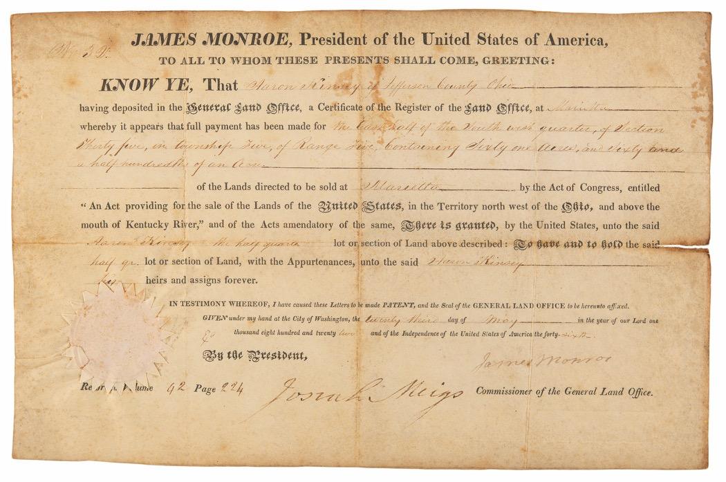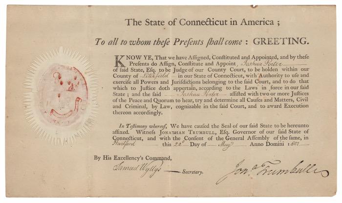 The recipient, Jedediah Huntington (1743–1818), served as a general in the Continental Army during the Revolutionary War, helping to fortify and hold Dorchester Heights in 1776, forcing the British to evacuate from Boston. He was later appointed by President George Washington to be the customs house collector for the coastal area from the Connecticut River to Rhode Island. Starting Bid $200