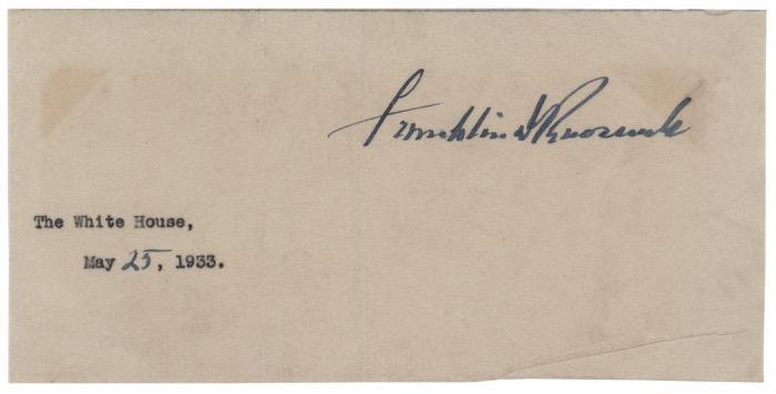20. Franklin and Eleanor Roosevelt Signed Photograph as President and First Lady. Uncommon vintage matte-finish 7.75 x 9.75 photo of a little boy holding an Easter basket on the South Lawn of the White House during the 1941 Easter Egg Roll event, signed in fountain pen as president and first lady by Franklin and Eleanor Roosevelt. The reverse is dated to April 14, 1941. In very good to fine condition, with a light unobtrusive vertical crease, a short edge tear, and the first half of Eleanor’s signature light but legible. Starting Bid $200