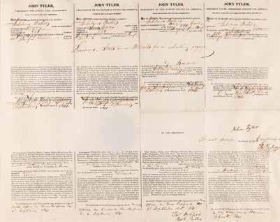 7. John Tyler and Daniel Webster Document Signed as President and Secretary of State for a Whaling Voyage. Partly-printed DS, signed “J. Tyler” as president and “Dan’l Webster” as secretary of state, one page, 19.25 x 15.5, September 2, 1841. Four-language ship’s paper issued to “Archelaus Baker, master or commander of the Barque called Cora…lying at present in the port of New Bedford, bound for Pacific Ocean and laden with Provisions, Stores and Utensils for a whaling voyage.” Boldly signed by President John Tyler and countersigned by Secretary of State Daniel Webster. The middle portion retains the original white paper seal. Handsomely matted and framed to an overall size of 27.5 x 23.5. In fine condition. Starting Bid $200