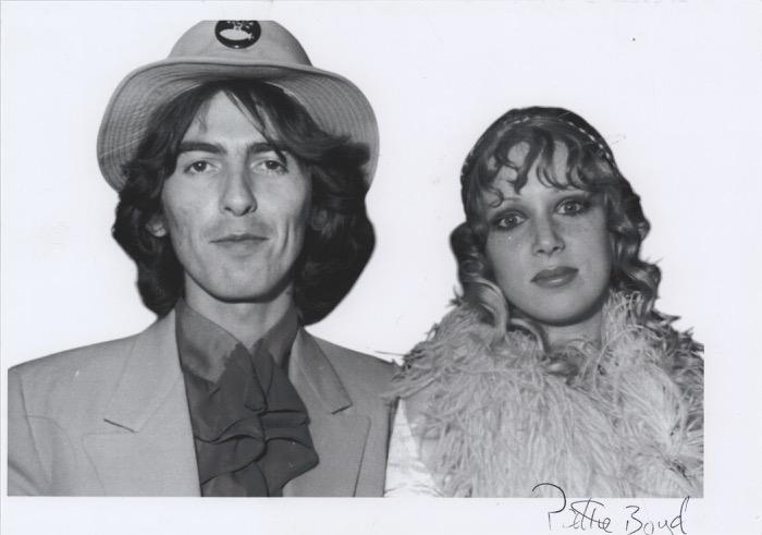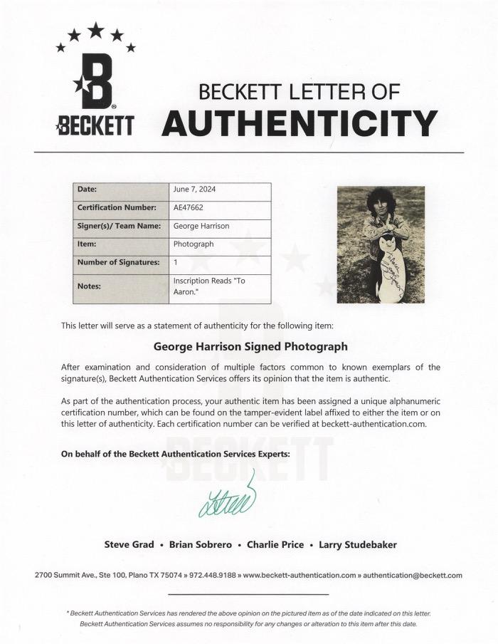 3027. John Lennon and George Harrison Signatures with (3) Original Candid Photographs - Obtained Outside Grauman’s Chinese Theatre on May 25, 1964. Vintage ballpoint signatures of John Lennon and George Harrison on an off-white 3 x 5 card, which bears a collector’s date notation of May 25, 1964. Includes three original glossy 5 x 3.5 candid photographs of Lennon and Harrison outside of Grauman’s Chinese Theatre in Los Angeles, California, on the morning of May 25, 1964, the same date the autographs were obtained. The three photos, which feature identifying captions to the borders, individually show: George Harrison and Pattie Boyd; John Lennon and his wife, Cynthia; and Harrison signing an autograph, with the Lennons and Boyd pictured walking in the background. n overall fine condition. Accompanied by three period newspaper clippings referencing Lennon and Harrison’s trip to Hawaii and Tahiti, which included a quick layover in Los Angeles, where the two Beatles did some sightseeing, which included visiting the stars of the Hollywood Walk of Fame. The two musicians took the trip to take a much-deserved break from the chaos of Beatlemania after the filming of their first movie, A Hard Day’s Night. Starting Bid $300