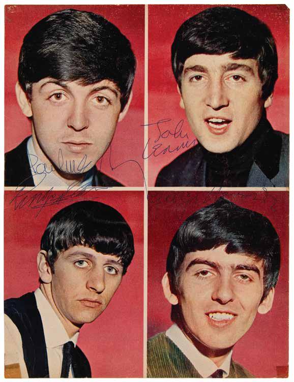 3002. Beatles Signed Rare Color Magazine Photograph (ca. Mid-1963). Vintage mid-1963 color 8.75 x 11.75 magazine photo of the Beatles, containing four individual portraits of the Liverpool musicians, signed on their respective images in blue ballpoint by Paul McCartney, John Lennon, Ringo Starr, and George Harrison. In fine condition, with small tape stains to the corner tips. Accompanied by full letters of authenticity from REAL and Beatles expert Frank Caiazzo. Only a handful of signed color photos of the Beatles are known to exist, making this an item of the utmost rarity. Starting Bid $1000