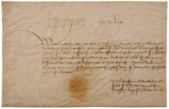 Vellum manuscript DS, signed “Henry R,” one page, 9 x 5.75, December 18, 1510. A warrant in the form of signet letters close to Andrew Wyndesore, Keeper of the Wardrobe, ordering material to be delivered to Humfrey Baryngton. In full: “We wol and charge you that ye delyvre or doo to be delyvred unto oure welbeloved s[erva]unt Humfrey Baryngton for his watching clothing ffyve yerdes of london russet of as goode assuete as thoder yomen of o[ur] cha[m]bre hath ben used and accustomed to have. And thies o[ur] l[ett]res shalbe youre sufficient warraunt and discharge in that behalfe. Geven undre our signet at o[ur] mano[r] of Richemounte the xviiith day of decembre the seconde yere of o[ur] reigne.” In fine condition, with traces of a red wax seal toward the bottom.