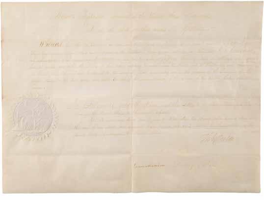 Last Dutch Director-General of the colony of New Netherland (1612–1672) who was a major figure in the early history of New York City. Manuscript DS in Dutch, signed “P. Stuyvesant,” one page, 16.75 x 13, May 15, 1664. Document with an impressive calligraphic header, “Petrus Stuyvesant,” issued at “Fort Amsterdam,” confirming a grant of land to Hendrick Sweerse on Long Island. Prominently signed at the conclusion in ink by Peter Stuyvesant as Director-General of New Netherland. The embossed paper seal affixed at the lower left remains largely intact. In good to very good condition, with professional repairs to separations of the intersecting folds, areas of ink erosion, and dampstaining (touching the signature). A sought-after example of a rare colonial autograph.