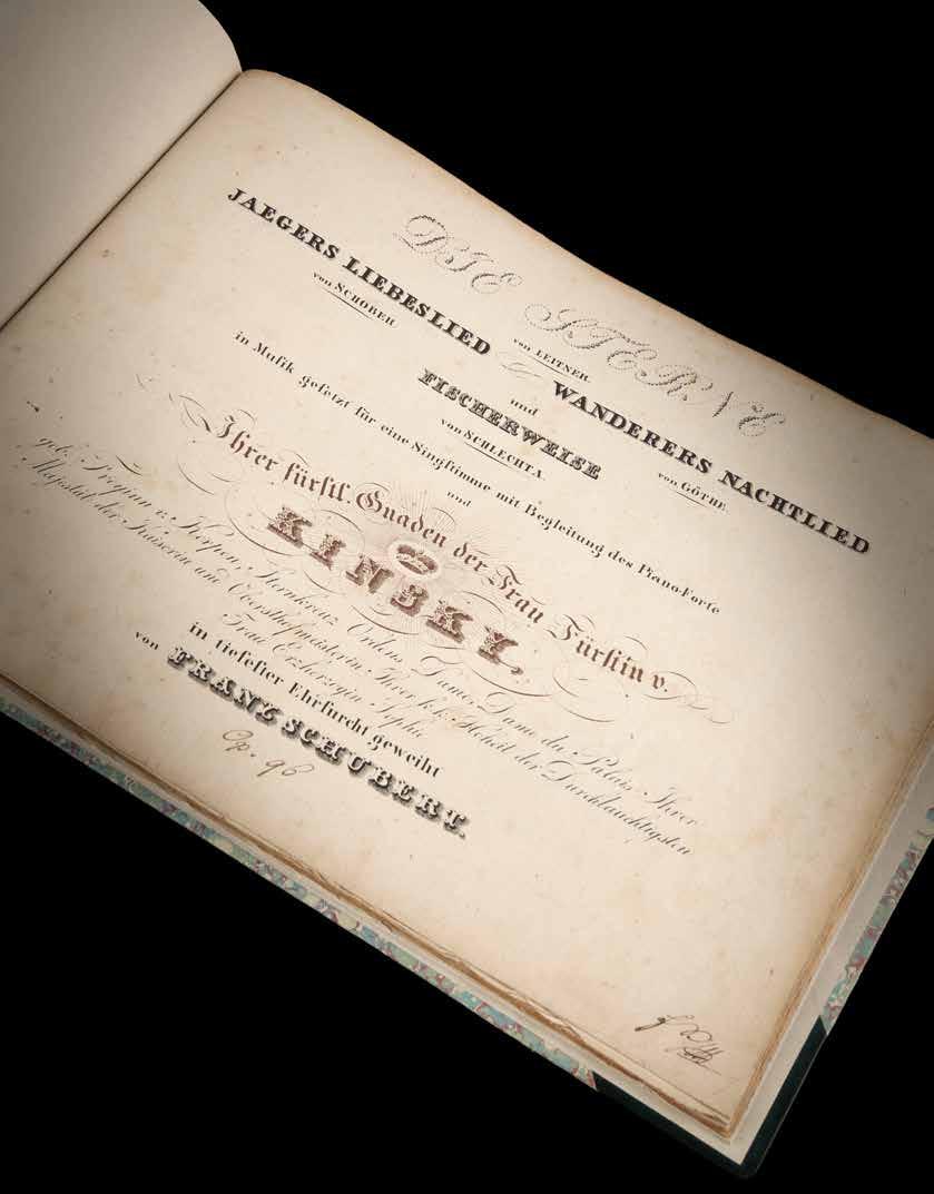 Prodigious Austrian composer (1797–1828) whose vast oeuvre comprised over 600 secular vocal works (mainly lieder), seven complete symphonies, sacred music, operas, incidental music, and a large body of piano and chamber music. Known only to a relatively small circle of admirers in Vienna during his lifetime, Schubert’s international renown grew immensely in the decades after his death at the age of 31. Extremely rare signed music score for ‘Die Sterne von Leitner,’ printed in Vienna in 1828, 13 x 9.75, 17 pages, signed in the lower right corner of the title page in ink by Franz Schubert with his
