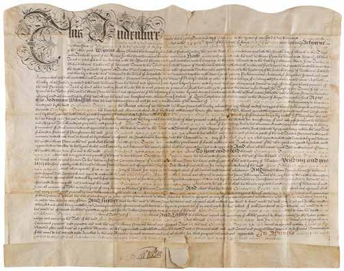 English-born Quaker (1644–1718) and founder of the colony that became the State of Pennsylvania. Historic partly-printed vellum DS, signed “Wm. Penn,” one page, 27.25 x 21.5, October 28, 1681. Indenture by which Penn conveys 5,000 acres of land in the newly chartered Pennsylvania to Christopher Taylor for the sum of £100. In part: “Whereas King Charles the Second…hath given and granted unto the said William Penn, his heirs and assigns, all that tract or part of land in America…together with divers great powers, pre-eminences, authorities, royalties, franchises and immunities; and hath erected the said tract of land into a province or signory, by the name of Pensylvania, in order to the establishing of a colony and plantation in the same…for and in consideration of the summe of one hundred pounds…paid by the said Christopher Taylor…assign the full and just proportion and quantity of five thousand acres.” Neatly signed in the lower margin in ink by William Penn. Affixed by its top edge to a 32.5 x 23.5 mat. In very good condition, with soiling, staining, and small areas of loss at the fold intersections.