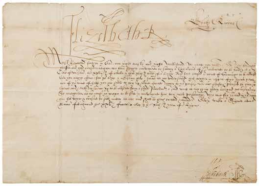 LS signed “Elizabeth R,” one page, 12 x 8.5, October 25, 1601. Letter to Matthew Hutton, Archbishop of York, excusing him from personally attending the new session of Parliament, on the grounds of age and infirmity, and instructing him to appoint a proxy. In part: “Where for divers causes and good considerationes, we have thought convenient to summon our high Court of Parlement to be holden at our Citie of Westm[inster], the xxvijth of october in the xliijth yeere of our Raigne. And have caused our writt of Sommonce to be addressed unto you among others for your being & assisting there: for as much as we understand that neyther in respect of your greate yeeres nor of your want of helth you are hable to com up w[ith]out greate danger to your parson. We are therfoer pleased to give you licence and heerby doo licence you to be absent.” In very good to fine condition, with scattered light dampstaining and old expert repairs to split folds.