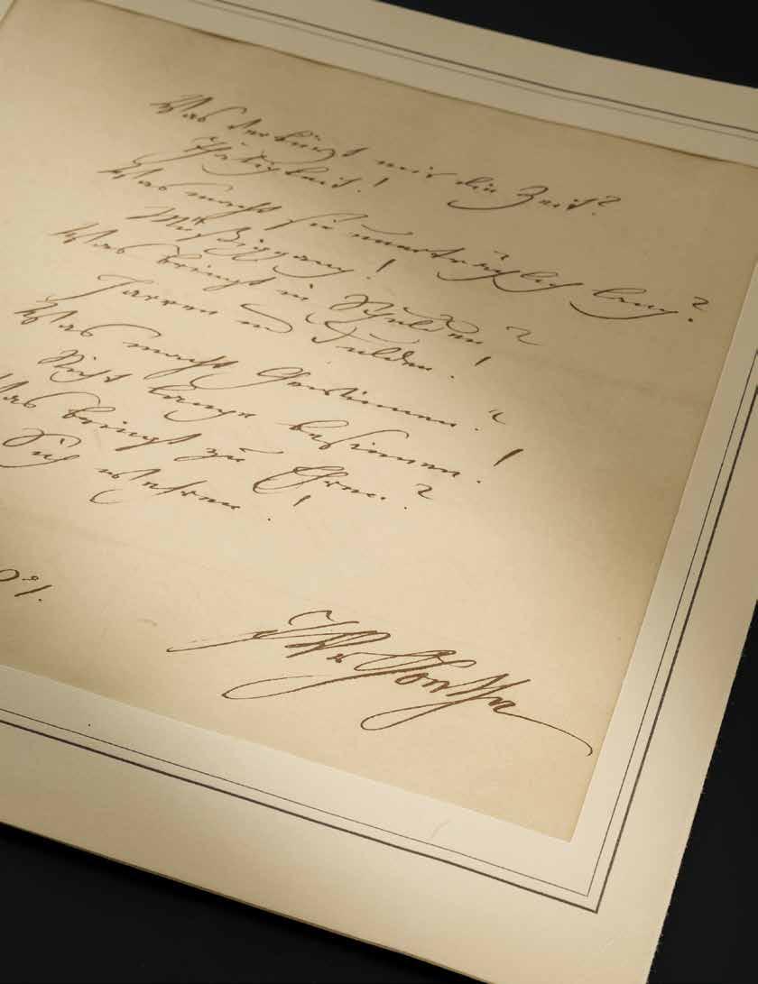 Of the nine known Bäsle letters, five reside in major institutional collections (four at the British Library and one at the Pierpont Morgan Library). The whereabouts of three others are unknown. The present Letter No. 7 is the only example known to appear at public sale, representing a singular opportunity to acquire one of the most celebrated private letters in Mozart’s corpus.