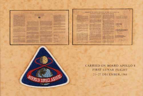 6085. Apollo 8 Patch and (2) United Nations Space Treaties [Attested as Flown]. Embroidered mission patch and two United Nations space treaties attested to as being flown during the Apollo 8 mission, all of which are affixed to their original 13.5 x 9 presentation certificate with a printed caption certifying their flown status: “Carried On Board Apollo 8, First Lunar Flight, 21-27 December, 1968.” The certificate also bears faded autopen signatures of crew members Bill Anders, James Lovell, and Frank Borman. Matted and framed together to an overall size of 21.5 x 17. In overall fine condition. Starting Bid $200