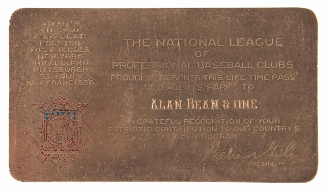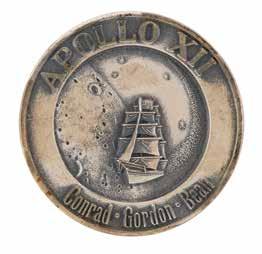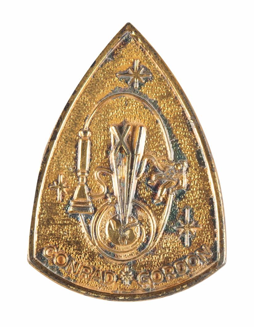6035. Gemini 11 Flown Fliteline Medallion - From the Personal Collection of Charles Conrad. Charles Conrad’s flown gold-plated sterling silver Gemini 11 Fliteline medallion, .75˝ x 1˝, with the front featuring a raised design of the mission insignia and the reverse engraved with the mission date, “Gemini XI, Sept. 12-15, 1966.” Hallmarked “Sterling” at the bottom. Condition is mint state, with slight tarnishing to reverse. Accompanied by a signed certificate of authenticity from Charles Conrad: “This gold plated sterling silver Gemini XI medallion flew in space from September 12 to 15, 1966. I was mission commander…The medallion is from my personal collection.” Starting Bid $300