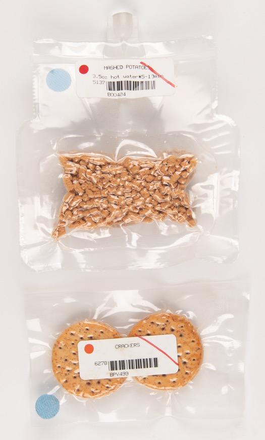 6036. Gemini 8 Flown Space Food Packets (2) - From the Personal Collection of Dave Scott. Dave Scott’s lot of two flown food packets that were carried into geocentric orbit during the Gemini 8 mission, which includes: a 3 x 3.5 packet of “Chocolate Cubes,” bearing a small swatch of Velcro, and labels to either side that read: “0252” and “Serial No. FAW 010”; and a 2.75 x 3 packet of “Chewing Gum,” with a punch hole to the upper right and the reverse bearing a small swatch of Velcro. In overall fine condition. Accompanied by a signed letter of authenticity from Scott. After completing the world’s first orbital docking, the Gemini VIII capsule, still docked to the Agena, began to roll. The crew undocked from the Agena and determined the problem to be a stuck thruster on the spacecraft, which now tumbled at the dizzying rate of one revolution per second. Neil Armstrong and Dave Scott used the capsule’s reentry control thrusters to stop the motion, an emergency decision that forced them to end their mission just ten hours after launch. Starting Bid $300