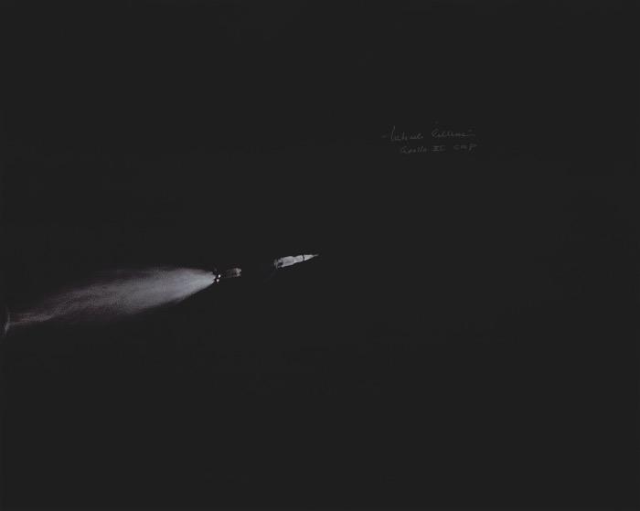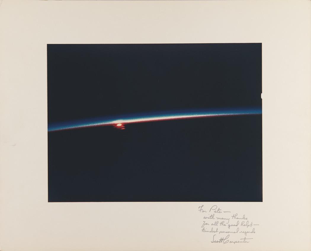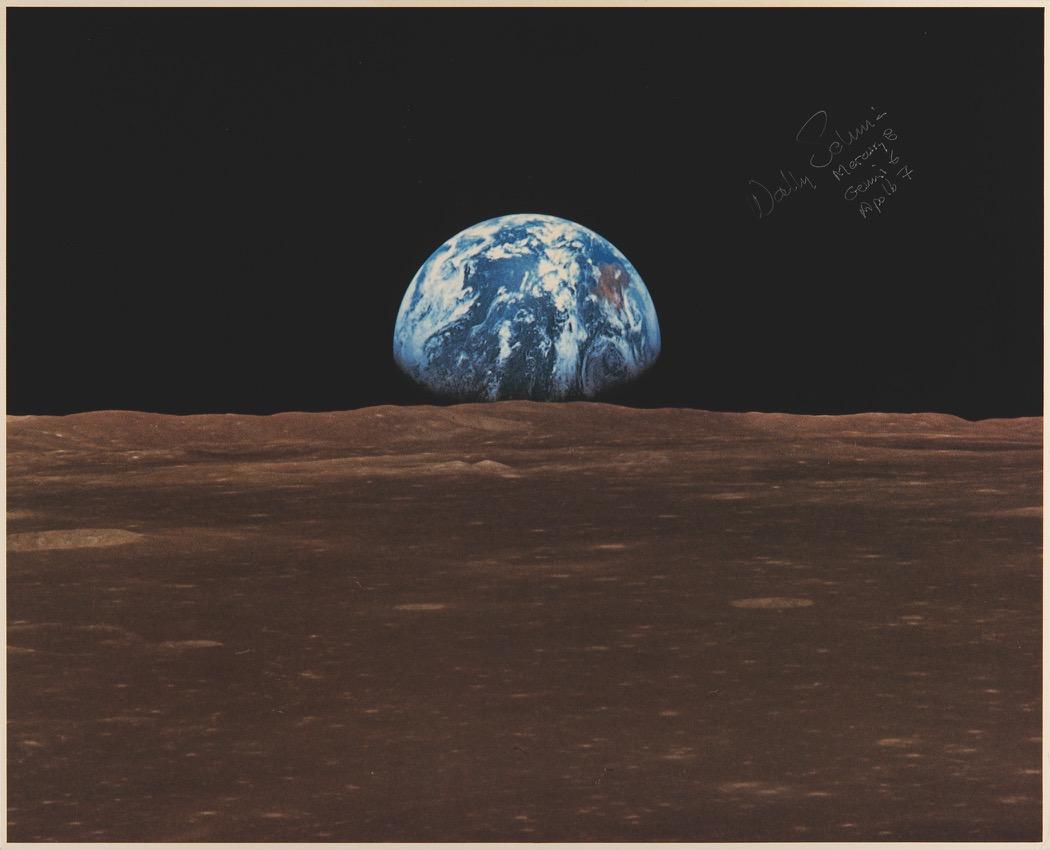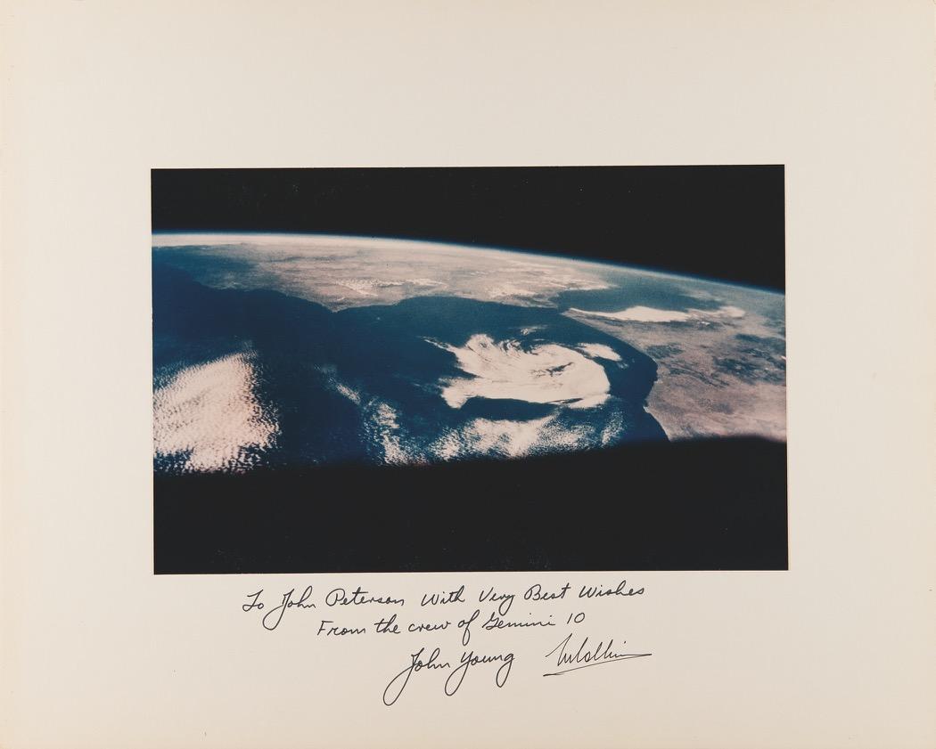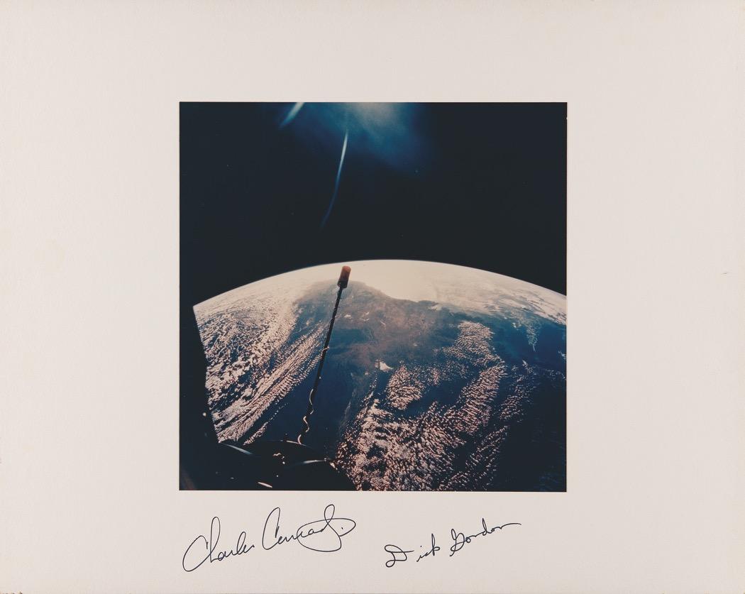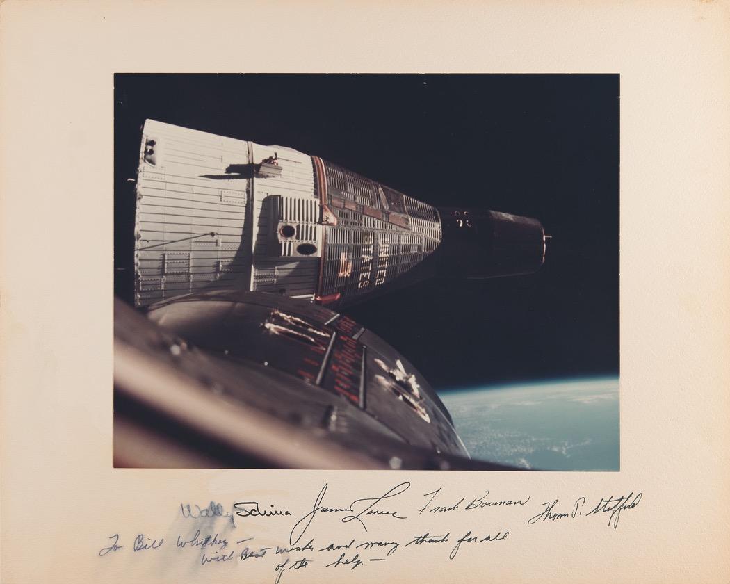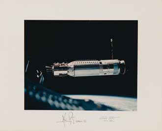6034. Gemini 8 Signed Oversized NASA Photograph. Superb official color semi-glossy 13.75 x 11 NASA photo of the Agena target vehicle as viewed from the Gemini 8 spacecraft prior to docking, with the Earth horizon visible below, affixed to its original 20 x 16 cardstock mount, which is signed neatly in black ink and felt tip, “Neil Armstrong, Gemini VIII” and “Dave Scott, Gemini VIII.” In fine condition. A beautiful crew-signed display piece honoring the historic Gemini 8 mission.