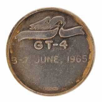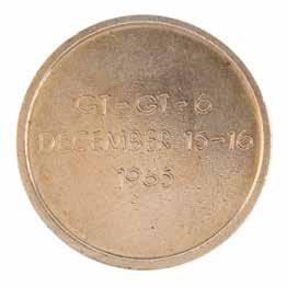6038. Gemini 6 Flown Gold-Plated Fliteline Medallion - From the Collection of Bailey K. Howard. Flown gold-plated Gemini 6 Fliteline medallion, approximately 1˝ in diameter, with a raised design of the ‘Castor and Pollux’ mission insignia on the front, and the reverse engraved: “GT-GT-6, December 15–16, 1965.” Condition is mint state, with noticeable fading to the gilt plating. A highly desirable flown medallion given that of the few examples that traveled with Wally Schirra and Tom Stafford on the Gemini 6 mission, only 10 were gold-plated, with the balance minted in silver. RR Auction confirms that this flown Gemini 6 Fliteline medallion was professionally tested by a Thermo Scientific Niton machine, which detected the presence of gilt plating. From the collection of Bailey K. Howard, the originator of the Fliteline medallions. Starting Bid $200