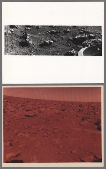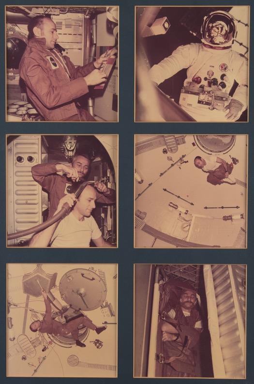 6074. Apollo 7 Flown Cue Card from the First Live Television Broadcast from an American Spacecraft. Iconic flown television cue card from the historic flight of the Apollo 7 mission, which transmitted the first live television broadcast aboard a crewed American spacecraft on October 14, 1968. The cue card, 8.5 x 5.5, famously reads in black felt tip, “From the Lovely Apollo Room high atop everything,” with the upper left corner featuring a small sketch of two Apollo astronauts enjoying a candlelight dinner in space. The card’s upper and lower right corners also appear to feature in-flight ink notations related to the spacecraft’s positioning: “SL 7139 +00, 71-46 +00” and “R 150, P 055, Y 017.” The card is displayed with two screenshots of the Apollo 7 broadcast, one