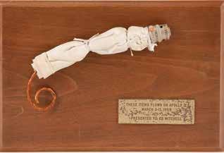 6095. Apollo 9 Flown Lunar Module Utility Light Cable with Plug - From the Personal Collection of Edgar Mitchell. Edgar Mitchell’s section of electrical utility light cord flown in Earth orbit on the Apollo 9 Lunar Module Spider, measuring 6˝ long, terminating in a four-pin cannon plug, marked: “LSC3908-400411.” Affixed to a wooden 9˝ x 6˝ plaque with engraved presentation plate: “These items flown on Apollo IX, March 3–13, 1969, Presented to: Ed Mitchell.” Within the protective Beta cloth cover is copper wire inside clear insulation, which was designed to power a small, portable utility light for the astronauts’ use inside the Lunar Module. In fine condition, with tarnishing to the plaque. Selected as an astronaut as part of Group 5 in 1966, Mitchell’s first assignment in the Apollo program was as part of the support crew for Apollo 9; it seems that he received this flown hardware presentation as a token of appreciation for his work in that role. Accompanied by a letter of authenticity from Karlyn Mitchell, the daughter of Edgar Mitchell. Starting Bid $300