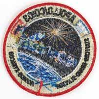 6069. Apollo 1 Crew Patch. Rare official embroidered patch for the Apollo 1 mission, 3.5˝ in diameter, originally and exclusively distributed to the crew and a handful of NASA workers. Designed by the crew, the Apollo 1 insignia depicts a command and service module flying over the southeastern United States with Florida (the launch point) prominent; the moon is seen in the distance, symbolic of the program’s ultimate goal. A yellow border carries the mission and astronaut names, set within another border featuring stars and stripes. Reverse bears the original “Stylized Emblem Co.” manufacturer’s label. In very fine condition. Starting Bid $200