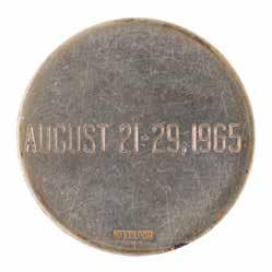 6040. Gemini 5 Flown Gold-Plated Fliteline Medallion - From the Collection of Bailey K. Howard. Flown gold-plated sterling silver Gemini 5 Fliteline medallion, approximately 1˝ in diameter, with a raised design of the “8 Days or Bust” mission insignia on the front, and the reverse engraved: “August 21–29, 1965,” and hallmarked “Sterling” at the bottom. Condition is mint state, with noticeable fading to the gilt plating. A desirable example given that only 10 of the purported 100 Fliteline medals that flew on the Gemini 5 mission were plated with gold. RR Auction confirms that this flown Gemini 5 Fliteline medallion was professionally tested by a Thermo Scientific Niton machine, which detected the presence of gilt plating. From the collection of Bailey K. Howard, the originator of the Fliteline medallions Starting Bid $200