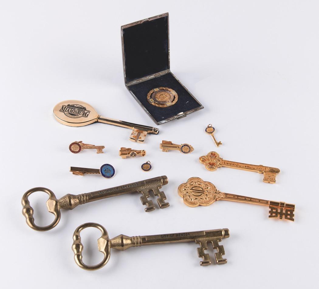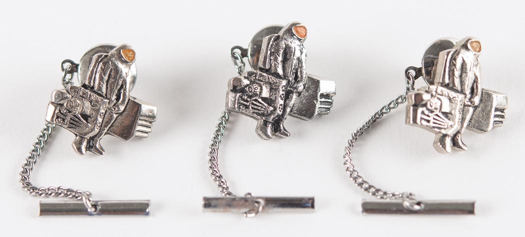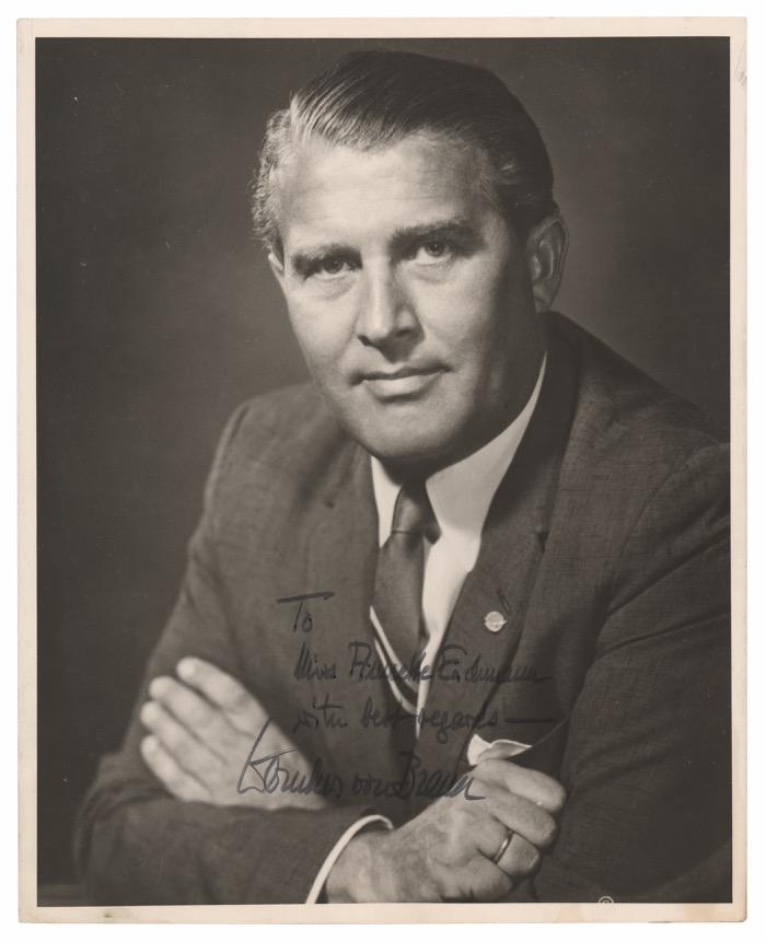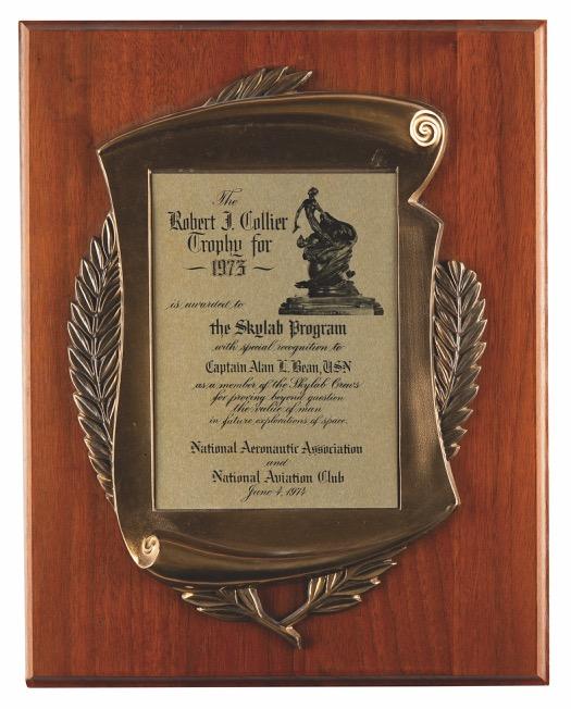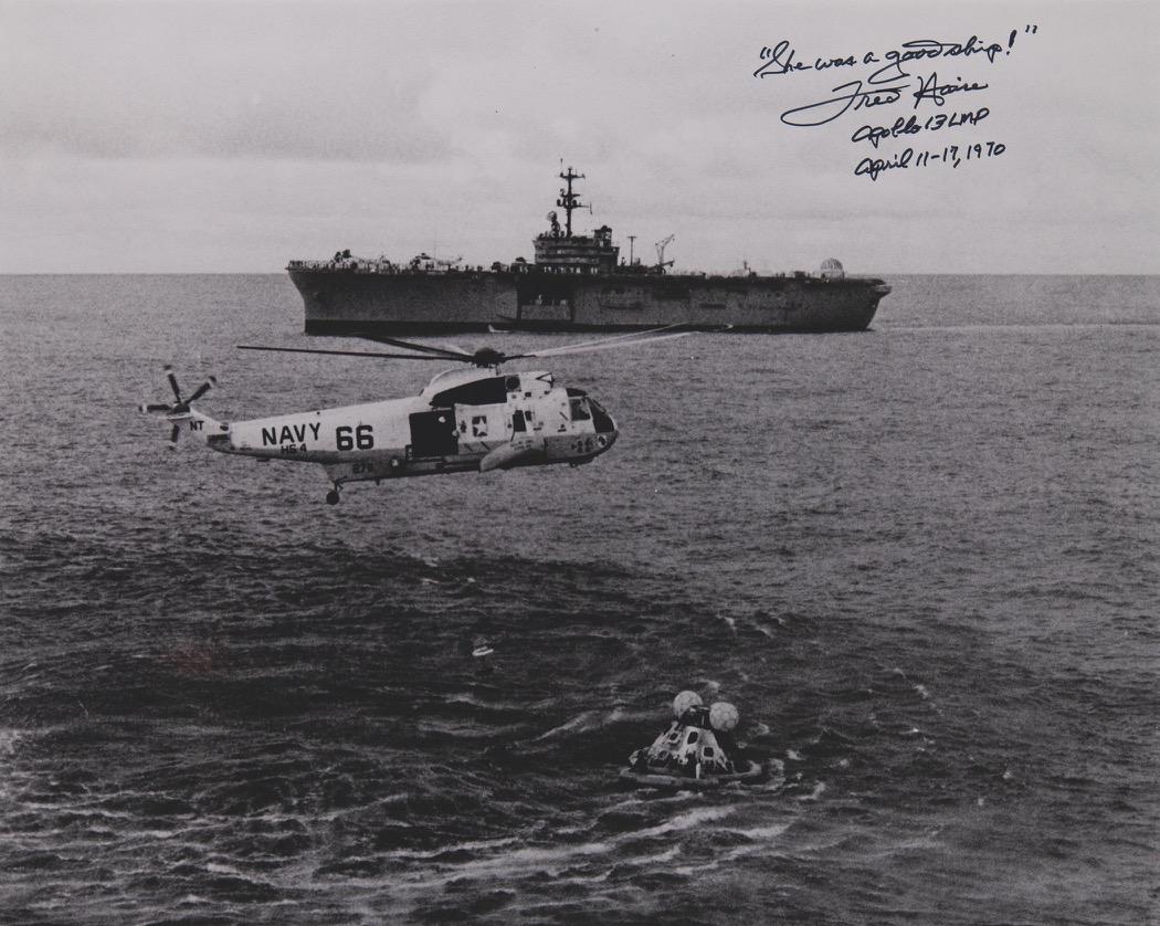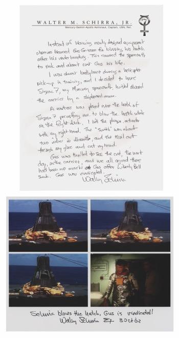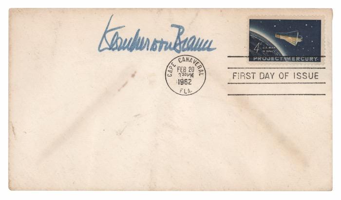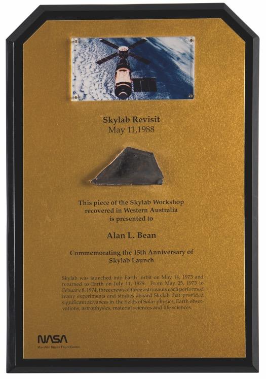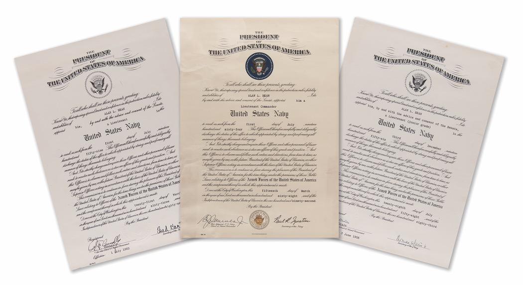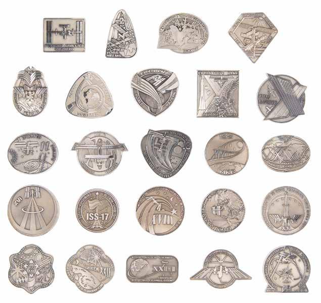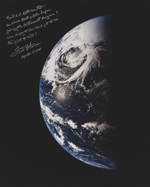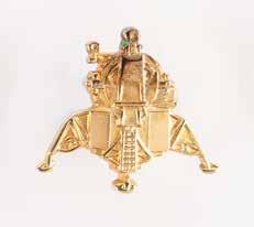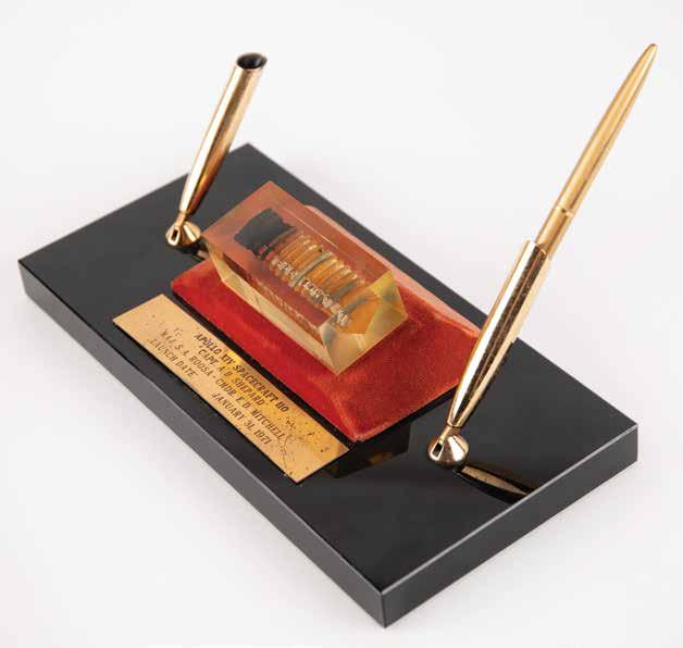 The unflown charms include: a three-dimensional 14K charm modeling a spacecraft launch tower; a gold-filled NASA ‘meatball’ charm; Wally Schirra’s 14K gold 1946 United States Naval Academy class charm, engraved on the reverse with his fiancée’s initials, “J.C.F.”; a remarkable three-dimensional 14K gold charm modeling the Gemini spacecraft, with doors that open to reveal two astronauts inside; a three-dimensional 14K gold charm modeling the Mercury capsule with escape tower; a 14K gold circular charm for the 20th anniversary of the Astronaut Wives Club, engraved “Wives Class XX”; a handsome sculptural golden charm portraying a cratered lunar surface with orbiting spacecraft, featuring a small diamond inset within a crescent moon on the right edge; and a sculptural 14K gold charm featuring a flower inset with three colorful stones, engraved on the reverse: “A Day to Remember: Book & Needle Club, Oradell, N.J., 10-16-62.” Accompanied by a detailed letter of provenance signed by Jo and Wally’s daughter, Suzanne Schirra. Starting Bid $2500
