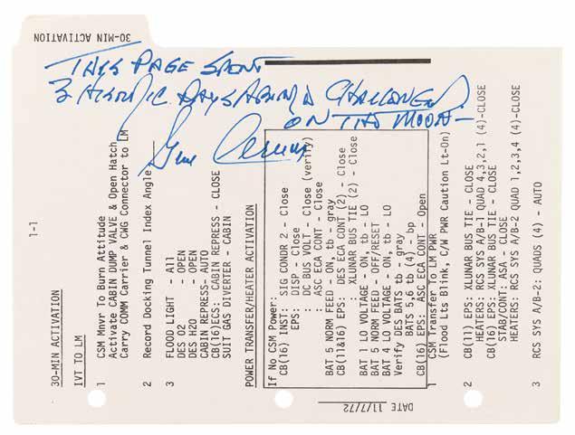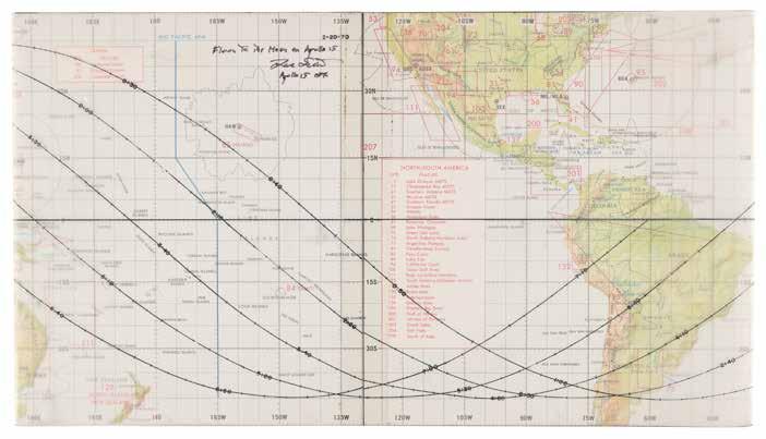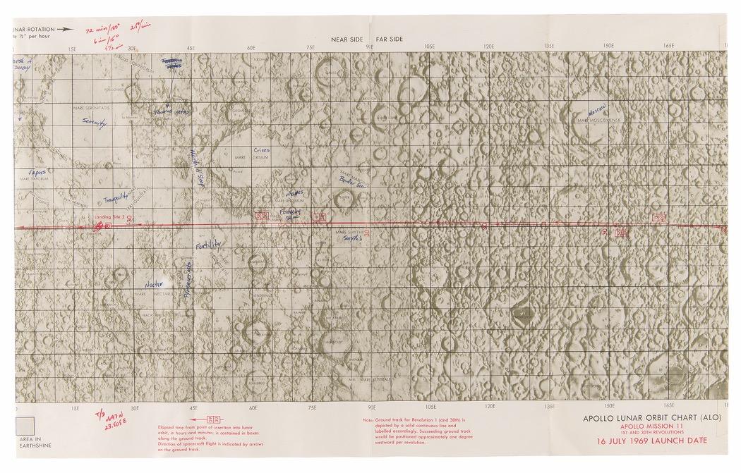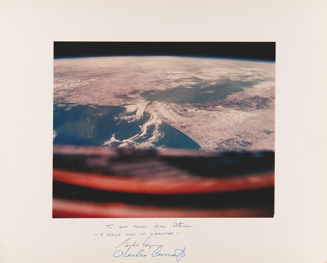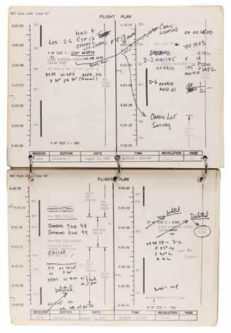 that the spacecraft was “dinged by a micrometeorite.” He also makes observations of weather patterns seen while in Earth orbit (“Large Storm,” “Storm Doreen,” and “Large Storm Eye”), and jots down some reminders: “Tell Hou about Pri scanner” and “Get Serious,” above scheduled flight plan updates. At 2:01:00, he makes a note to “Congratulate Gordo on exceeding his MA-9 Flight,” referring to crewmate Gordon Cooper’s 34-hour Project Mercury mission, in which he had become the first American to spend an entire day in space. The Gemini 5 mission was another record-breaker, coming in at 7 days, 22 hours, 55 minutes, 14 seconds—just under their ‘8 Days or Bust’ slogan, but still enough to set a new endurance record. Their flight might have been one day longer, but Gemini 5 was cut short due to the approach of Hurricane Betsy—perhaps one of the weather patterns observed while on orbit. The rear board bears two affixed Velcro strips for securing the plan within the Gemini spacecraft. In very good to fine condition, with general wear from use. Provenance: Collection of Charles Conrad, Lot 172, Odyssey Auctions, February 27, 1994. Starting Bid $1000